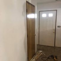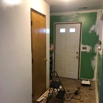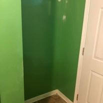 I had a lot of holes to fill in before I could paint. (Now I know why my Mom and Dad never let me put nails in the walls while under their roof!!) While I was allowing the filler to dry, I started my multitasking by removing the trim and base boards, Cutting, staining and varnishing the new trim.